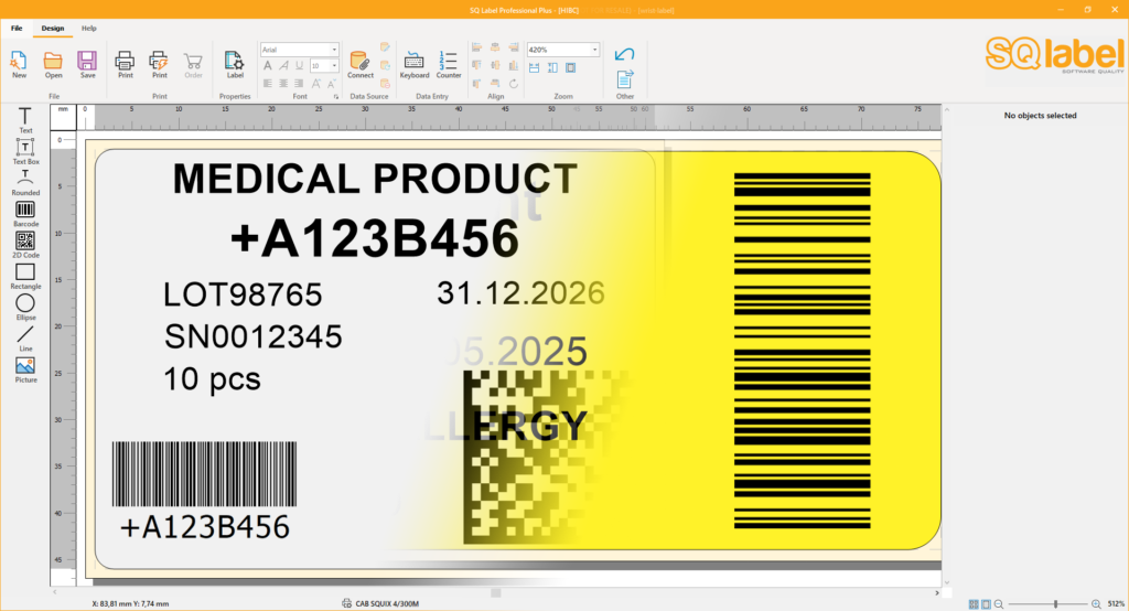 SQ Label delivers a professional solution designed specifically for hospitals, clinics, and medical manufacturers. With patient-centered templates, full barcode and HIBC support, and intuitive tools, SQ Label makes it simple to design and print accurate, compliant labels. The software is compatible with healthcare-grade printers, supports color-coded labeling for quick identification, and ensures reliable performance under critical conditions. For providers looking to eliminate manual errors, SQ Label Automation integrates directly with HIS, ERP, and pharmacy systems, enabling automated wristband creation, compliance-driven medication labeling, and error-free workflows that safeguard patients and streamline hospital operations.
